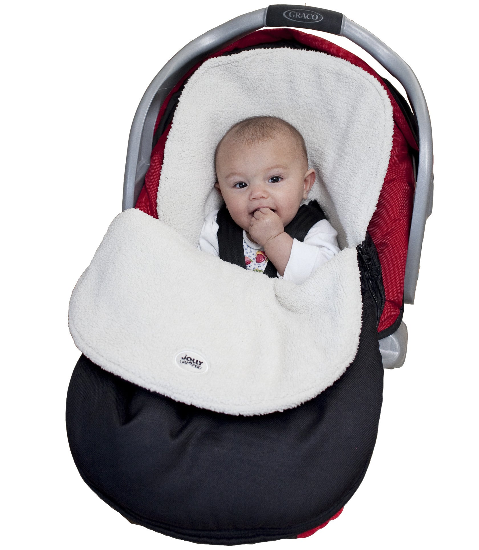 Jolly Jumper Cuddle Bag with Removable Cover makes traveling easier by eliminating the need for bulky outerwear and blankets. Baby is comfortably covered with soft fleece lining while the water resistant shell protects baby from the elements.