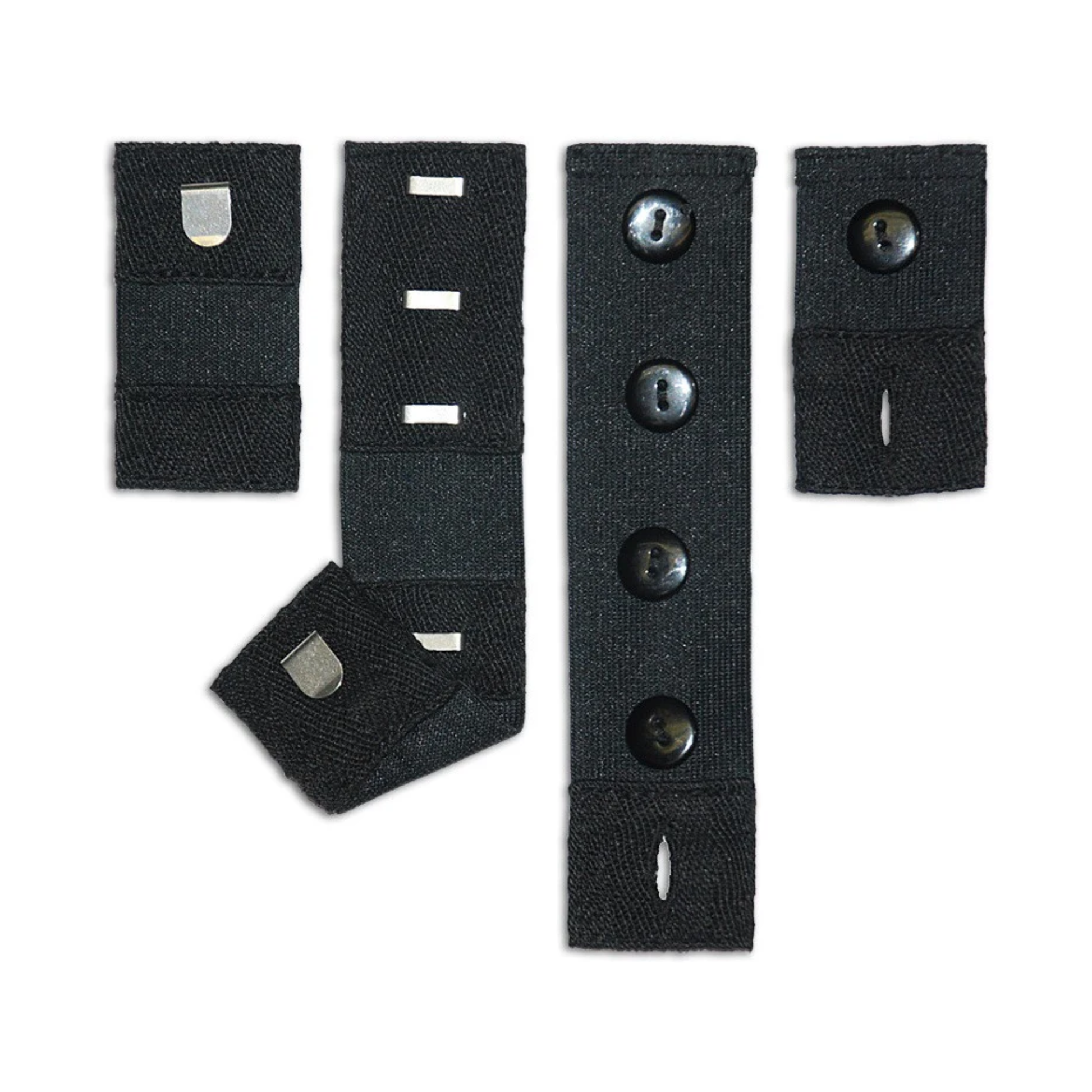 - 4 extenders included: 2 button extenders (large + small), and 2 hook extenders (large + small)