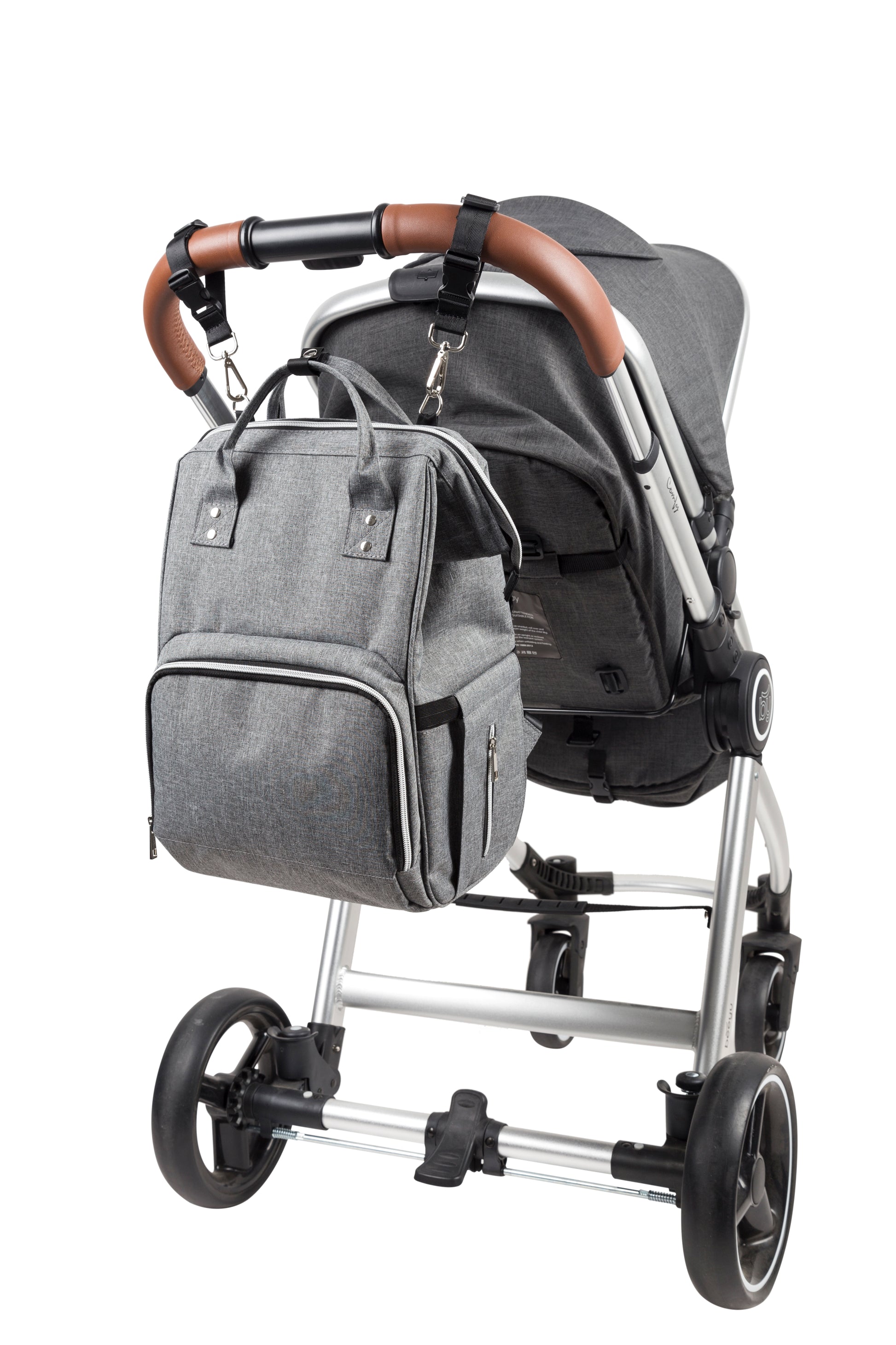 The Aspen Diaper Bag can be worn as a backpack or tote. It features a large framed opening for easy access.
