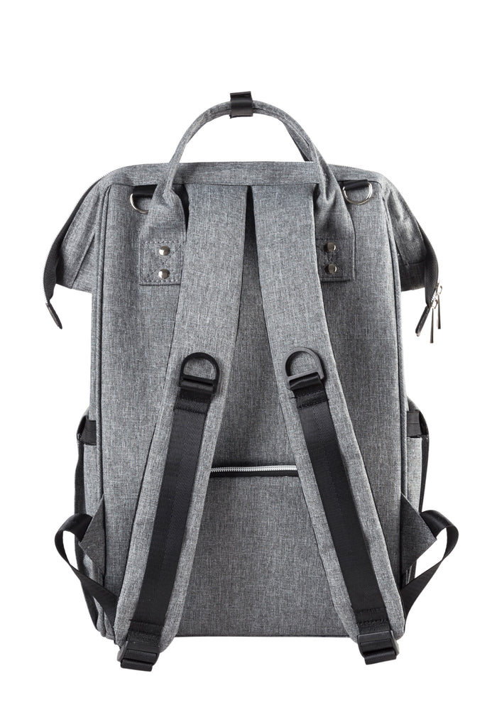 The Aspen Diaper Bag can be worn as a backpack or tote. It features a large framed opening for easy access.